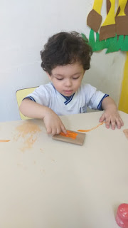 O objetivo desta atividade é que os bebês têm o contato com elemento da natureza: areia ,folha, pedras... eles estão explorando diferentes...